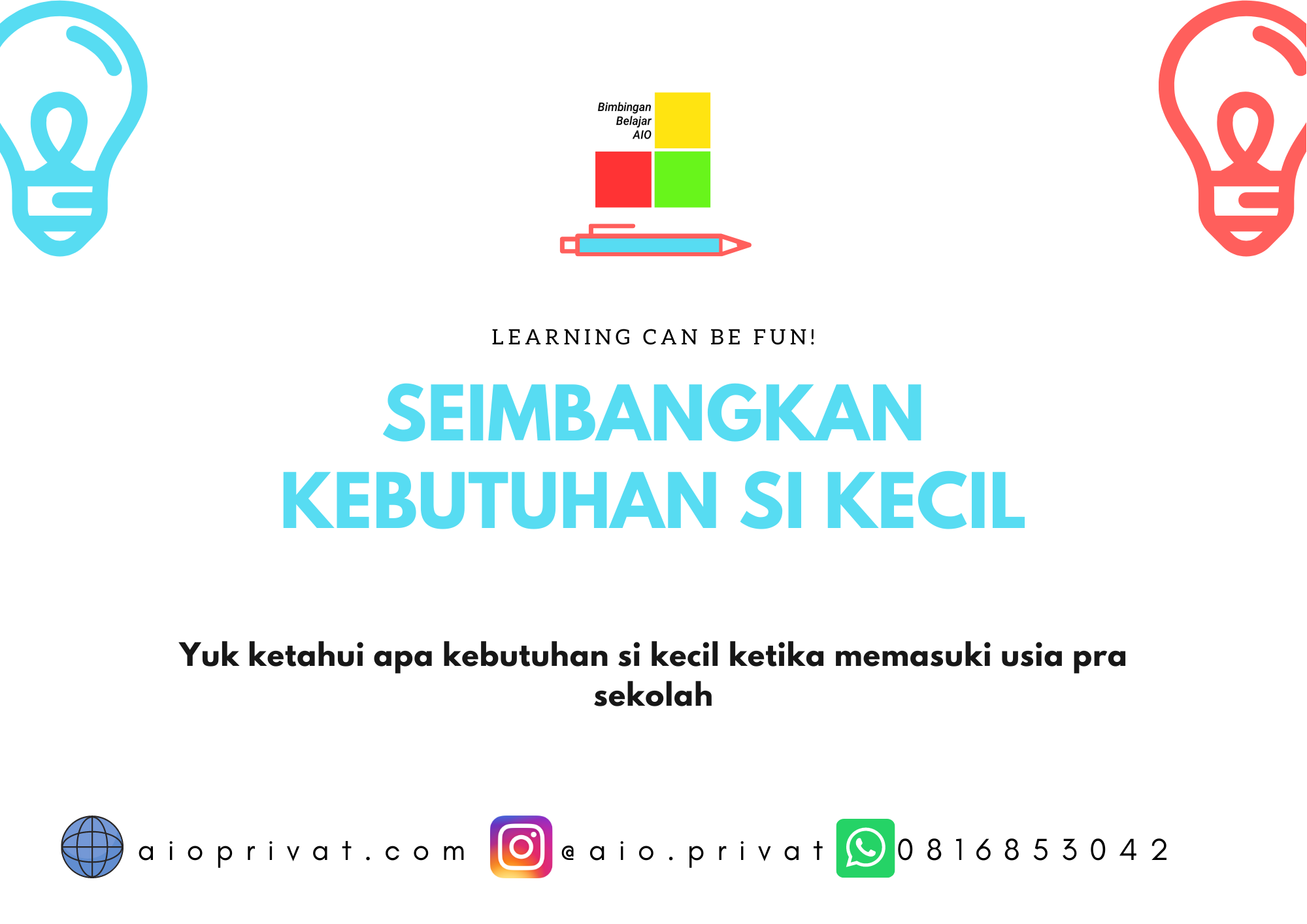 Untuk itu, pada fase ini yang umumnya anak akan dikenalkan dengan calistung. Bimbel AIO Privat punya cara berbeda dalam mengusir kebosanan anak ketika belajar. Kami akan mengkombinasikan belajar dengan cara yang asik dan tidak membosankan. Anak bisa belajar tanpa merasa tertekan, namun apa yang dipelajari bisa tersampaikan dan dipahami dengan baik.